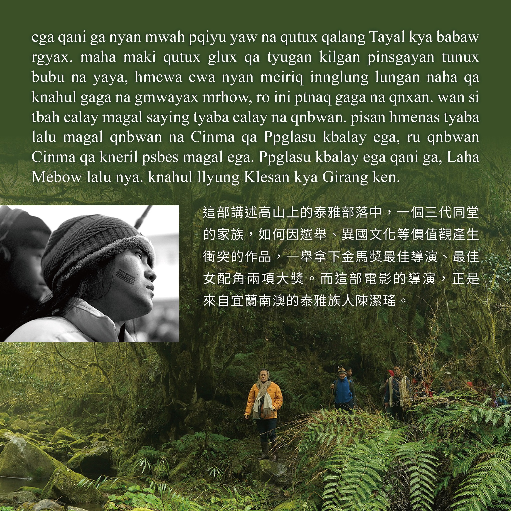 ▍ skahul kbalay Ega, pluhay mgayang pqiyu calay ke na Genzyumin, gaga qnxan ki lungan Tayal 透過電影自然傳遞原住民語言、文化與精神(P.102-107)✶ https://reurl.cc/NbaOa5