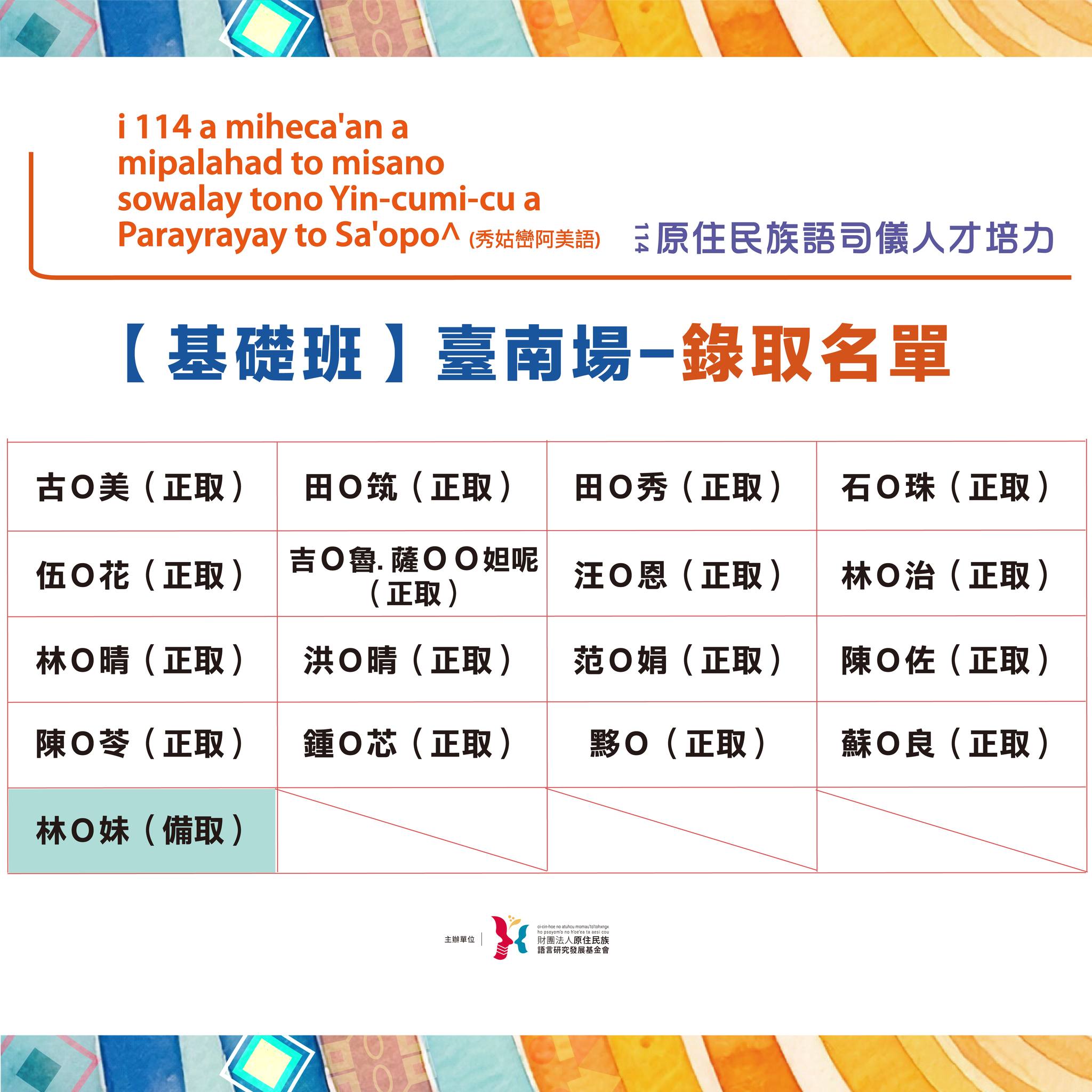 【114年度原住民族語司儀人才培力-基礎班|臺南場錄取名單公告】