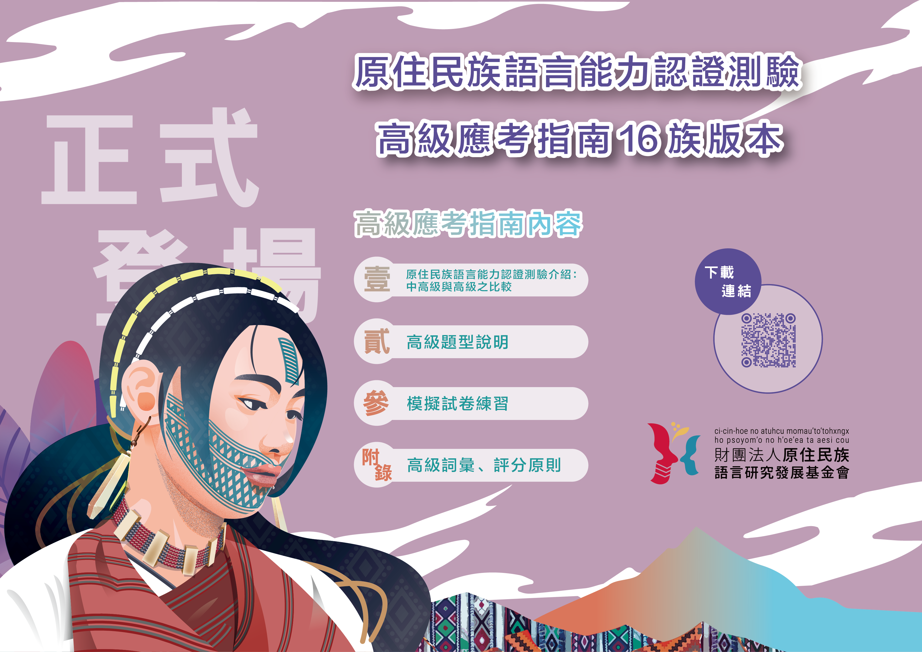 透過16族族人共同編輯「高級應考指南」學習教材的出版,提供足夠測驗資訊給考生,減少應試恐慌和緊張,提升每位族語學習者的族語能力及應試技巧。