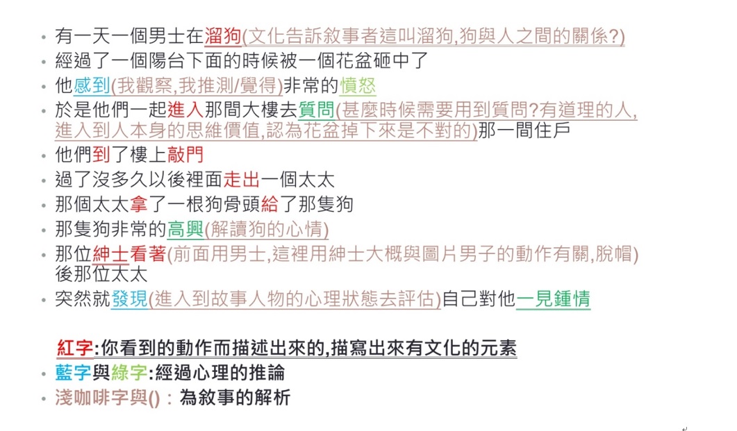 紅字:你看到的動作而描述出來的,描寫出來有文化的元素