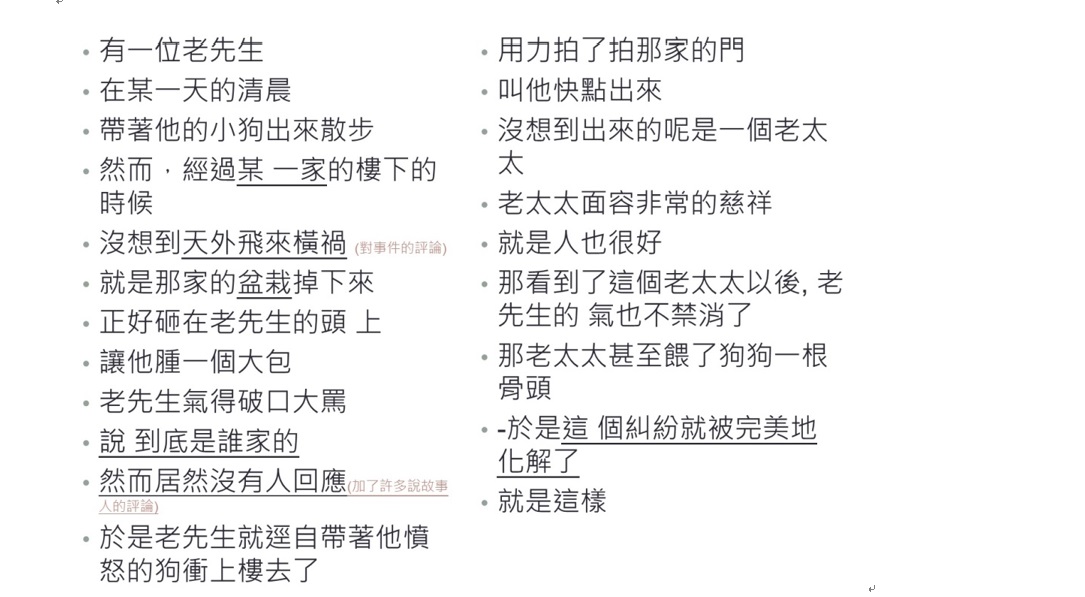談個人經驗,往往會有一個最高點結束。最高點就是,有一個問題得到答案,問題解決了,這就是高點。Labov分析了很多故事、生活經驗歸納出6種要素(大部分的故事可以用這6種分析):