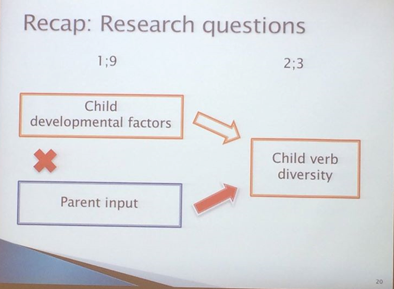在她的研究數據中發現,主要照顧者給小孩的各式詞量越多,小孩的動詞使用量也隨之成長,這個關聯證實在小孩的語言發展中,除了本身先天條件外,受到「某些」外來的刺激影響非常之大。