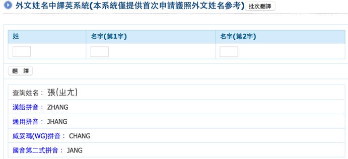 外文姓名中譯英系統」進行查詢,輸入姓名後系統會顯示「漢語拼音」、「通用拼音」、「威妥瑪(WG)拼音」、「國音第二式拼音」4種拼音供你選擇,你也可以直接參考「